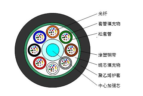 GYTS光纜的結構是將250µm光纖套入高模量材料制成的松套管中,松套管內填充防水化合物。纜芯的中心是一根金屬加強芯,對于某些芯數的光纜來說,金屬加強芯外還需擠上一層聚乙烯(PE)。松套管(和填充繩)圍繞中心加強芯絞合成緊湊和圓形的纜芯,纜芯內的縫隙充以阻水填充物。雙面涂塑鋼帶(PSP)縱包后擠制聚乙烯護套成纜。